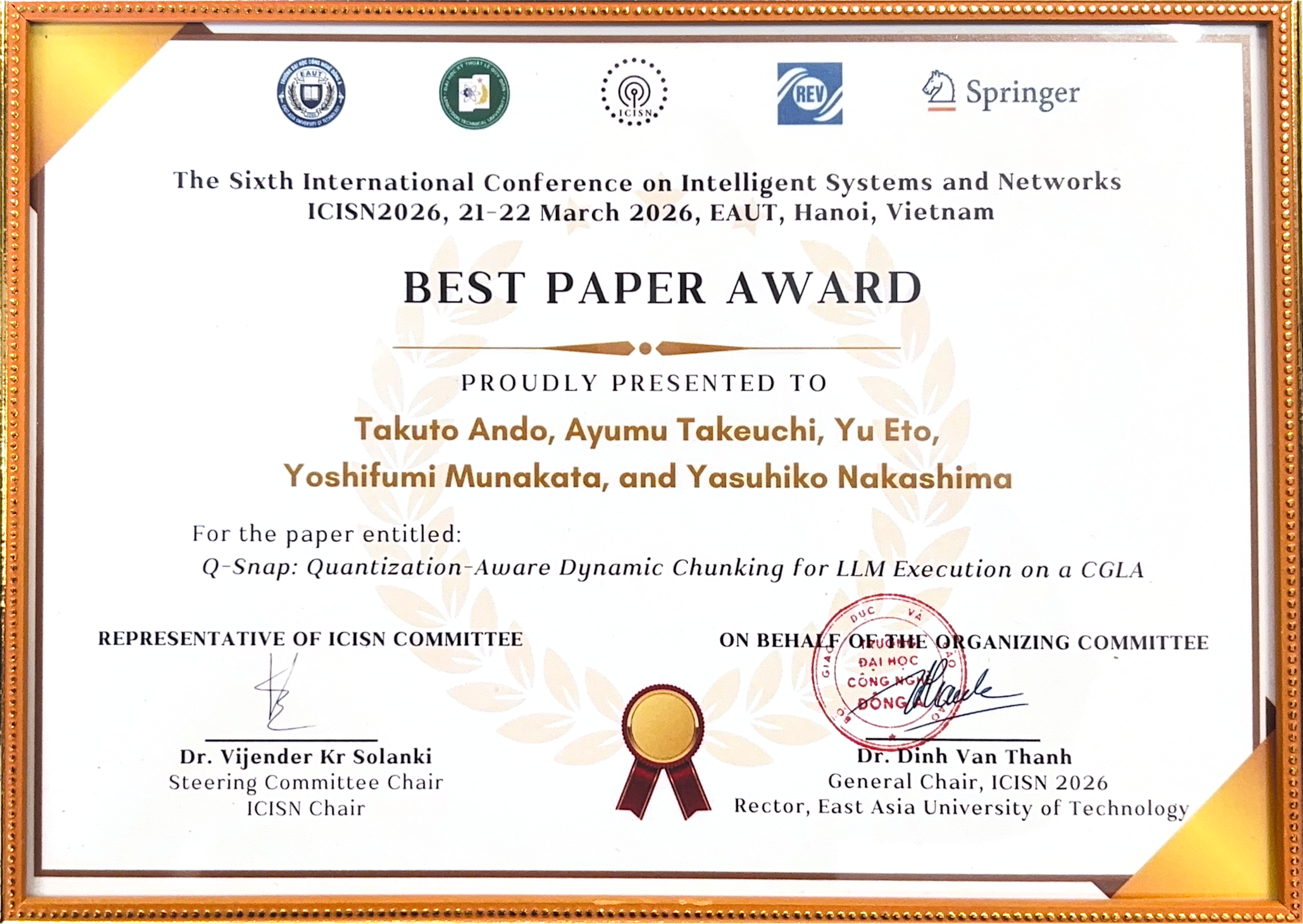 Best Paper Awardは、独創性、技術的な質、会議テーマとの関連性、そして研究コミュニティへの潜在的な影響といった点で、プログラム委員会および査読者から高く評価されました。この度、ICISN 2026のBest Paper Awardに選ばれ、表彰されました。